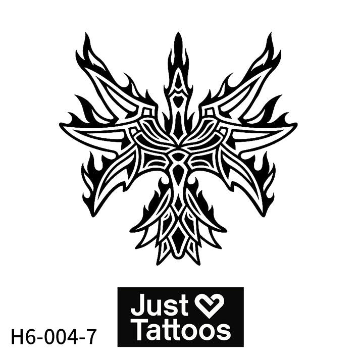 The artwork is a quintessential example of blackwork tattooing, utilizing bold, solid black fills and sharp, intricate lines. The absence of color highlights the dramatic contrast and graphic nature of the design, a signature of tribal art that makes it visually impactful and ensures it ages well on the skin. The symmetric design offers a balanced and commanding aesthetic. 2.4 in × 2.4 in