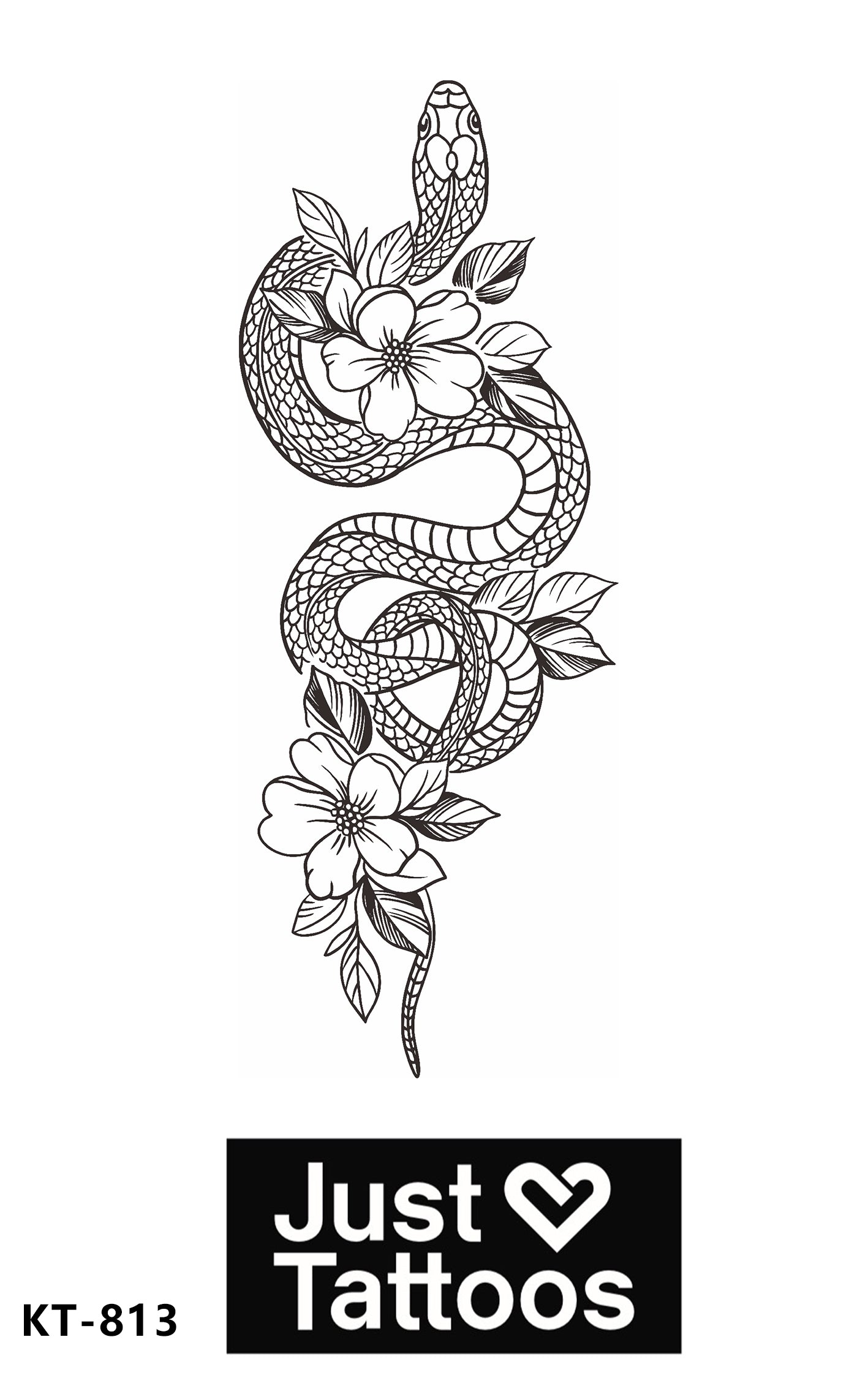 A striking black and white tattoo composition featuring an intertwined snake and floral elements. This expertly rendered design measures 4.7 x 7.08 inches, offering a balanced composition that works beautifully as a standalone piece or as part of a larger sleeve. The contrast between the serpent's sinuous form and delicate botanical details creates visual depth and symbolic richness, making it an ideal choice for those seeking meaningful body art with sophisticated aesthetic appeal.