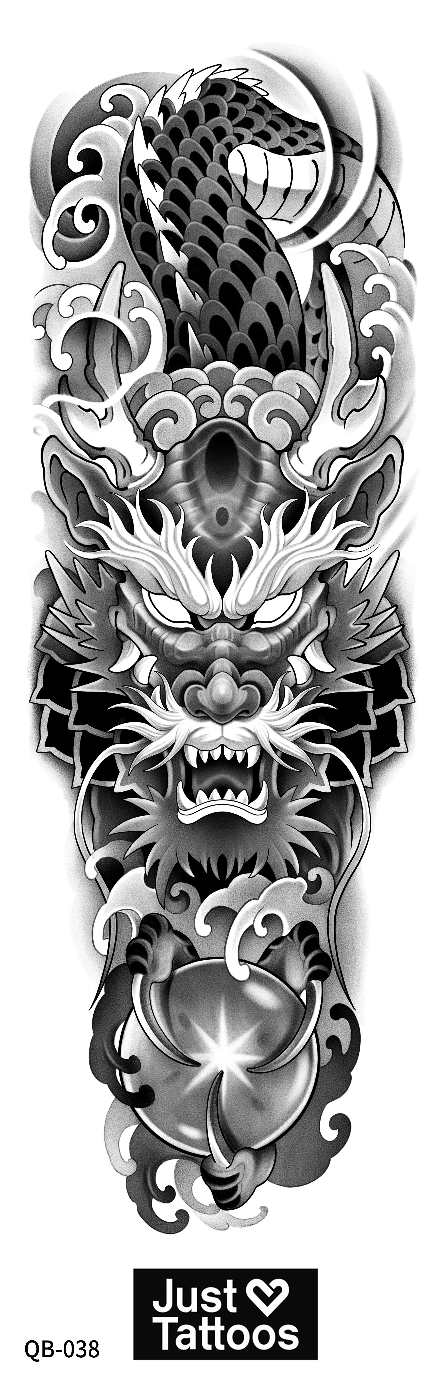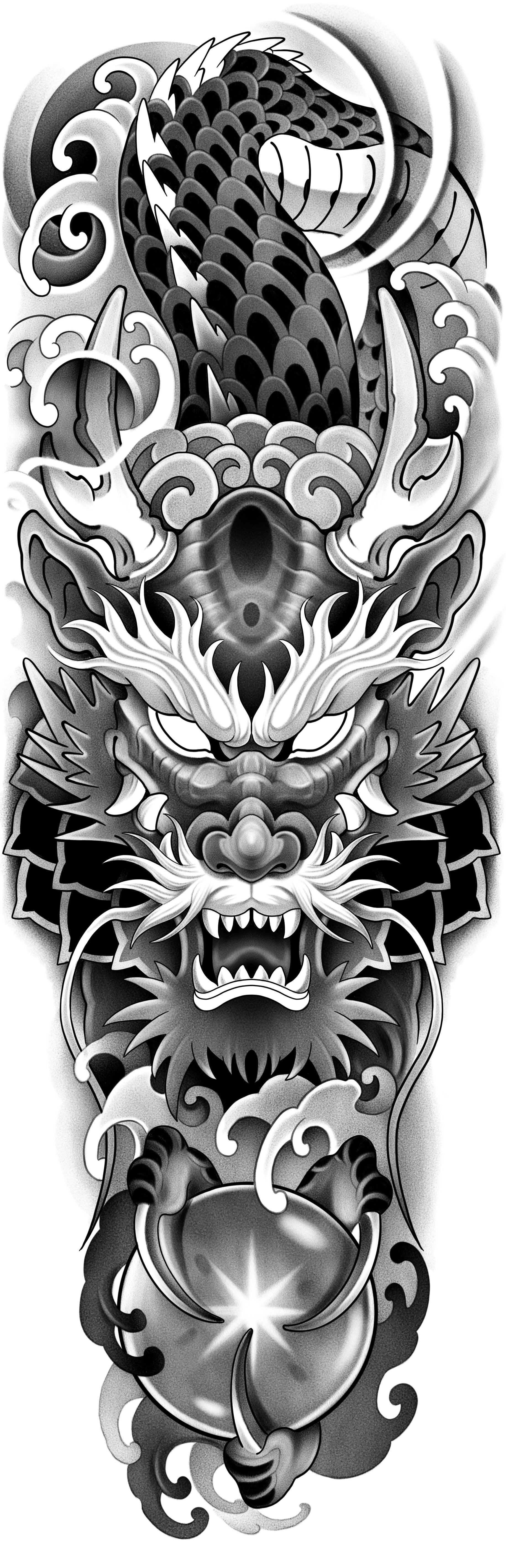 Unleash your inner mystique with this striking black and white dragon design, complete with a mesmerizing crystal ball centerpiece. Featuring intricate linework and bold details, this 18x6 inch tattoo captures the perfect blend of mythical power and magical allure. A showstopper for dragon enthusiasts and crystal lovers alike.